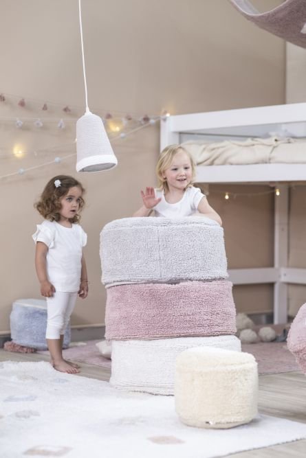 Cotton covered pouf, ideal for a child’s room. Functional and elegant, thanks to its size it does not take up much space and can be easily stacked. With this pouf, there is always an extra place!