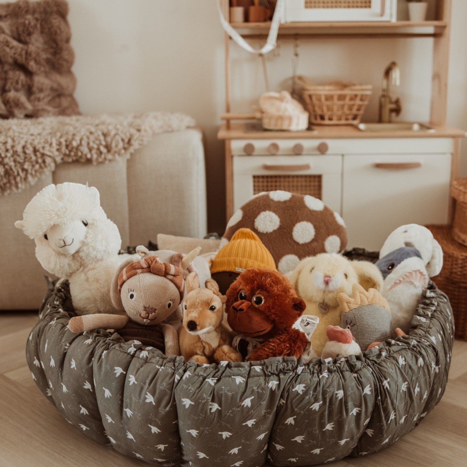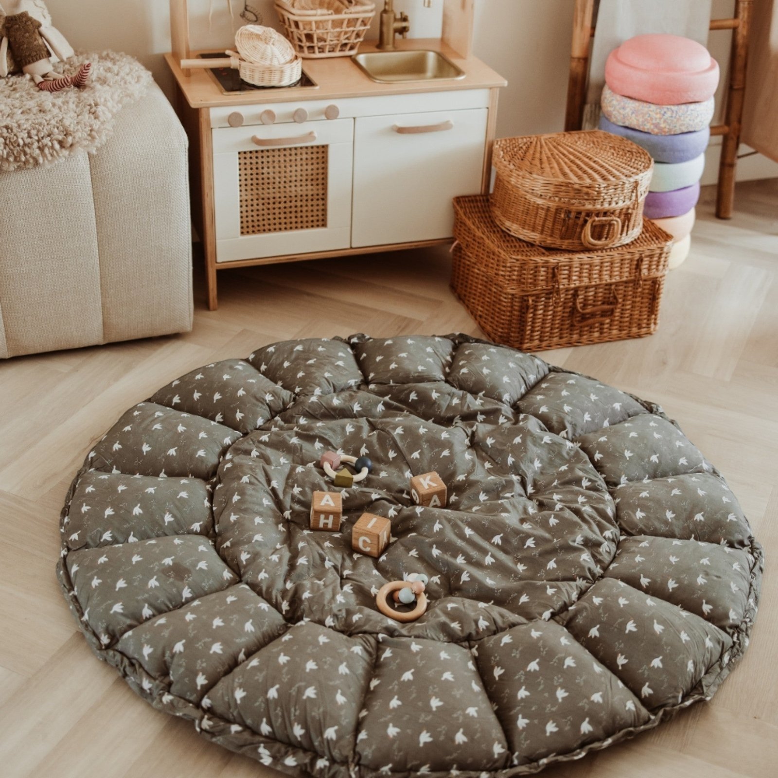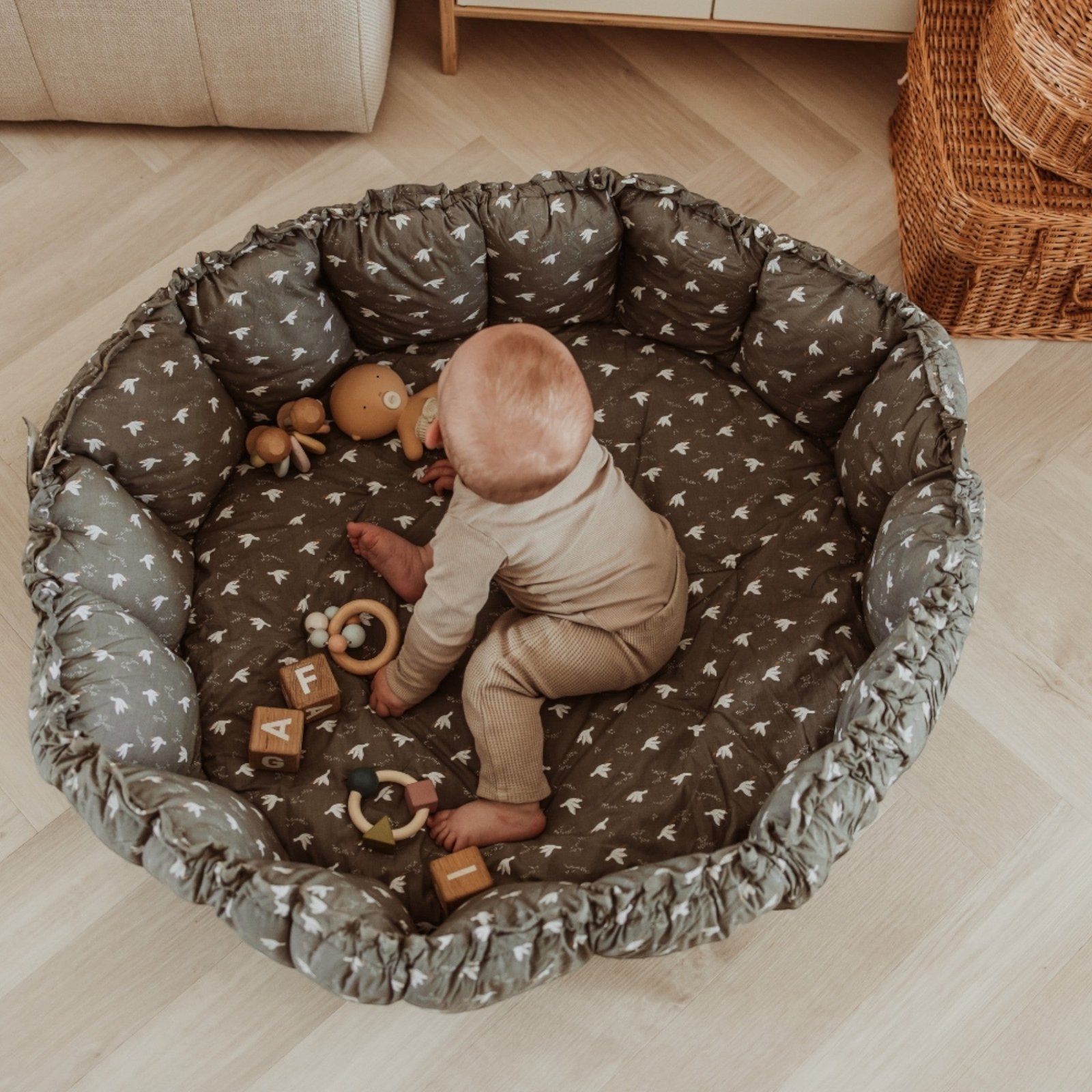 When the side protectors are raised, they create a safe nest for your baby. When the sides are opened, it transforms into a large, comfortable play mat. It can also be placed in the nursery as a storage space for your baby’s favorite toys, keeping them tidy.