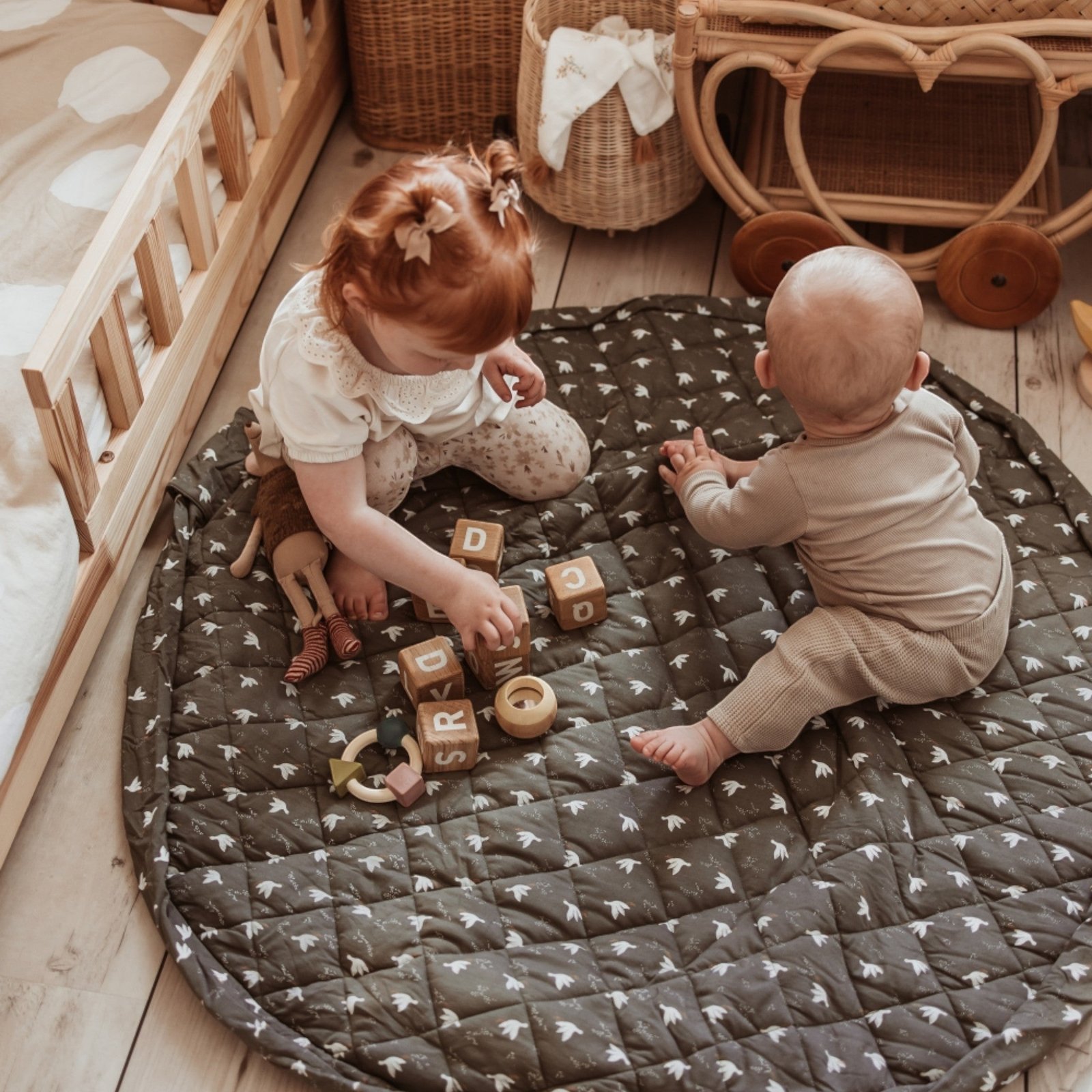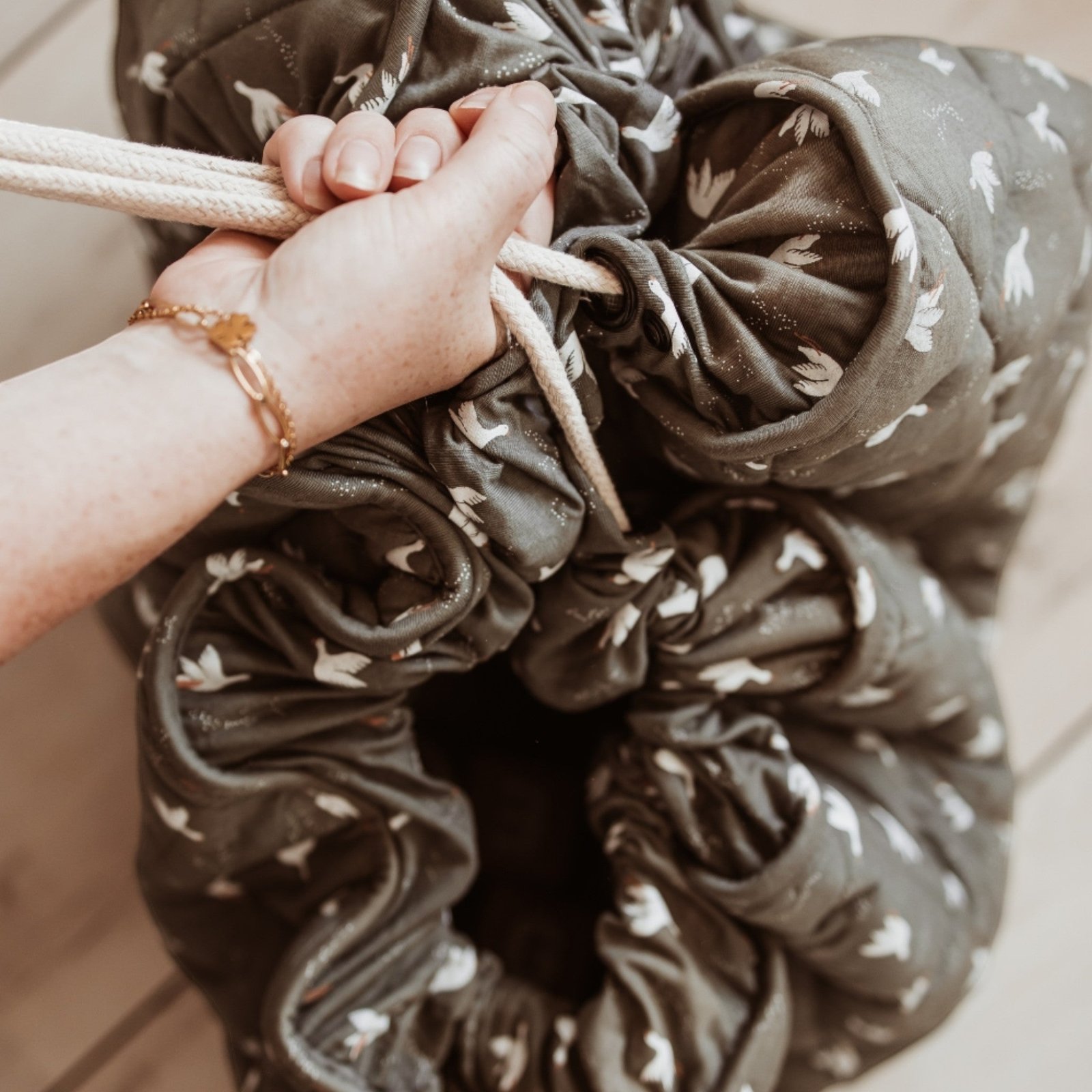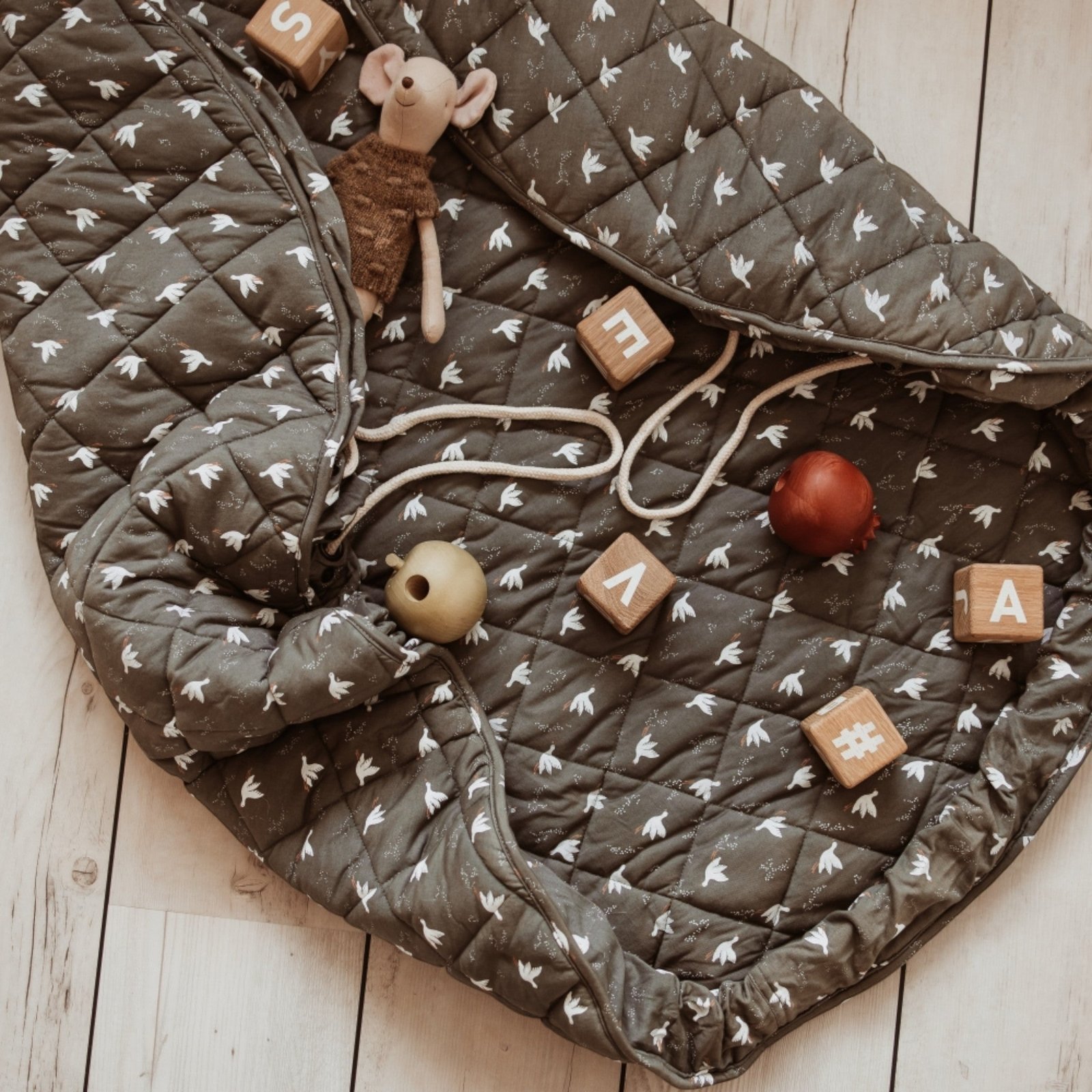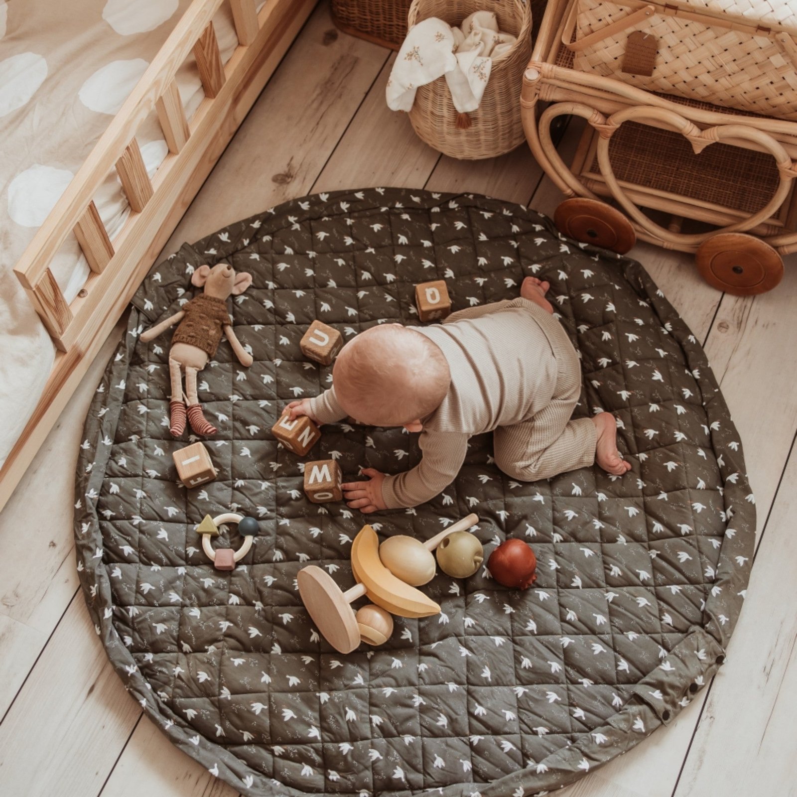 This unique soft play mat also functions as a convenient toy storage bag and diaper bag, made from certified GOTS organic cotton to ensure maximum comfort and enjoyment for your baby.