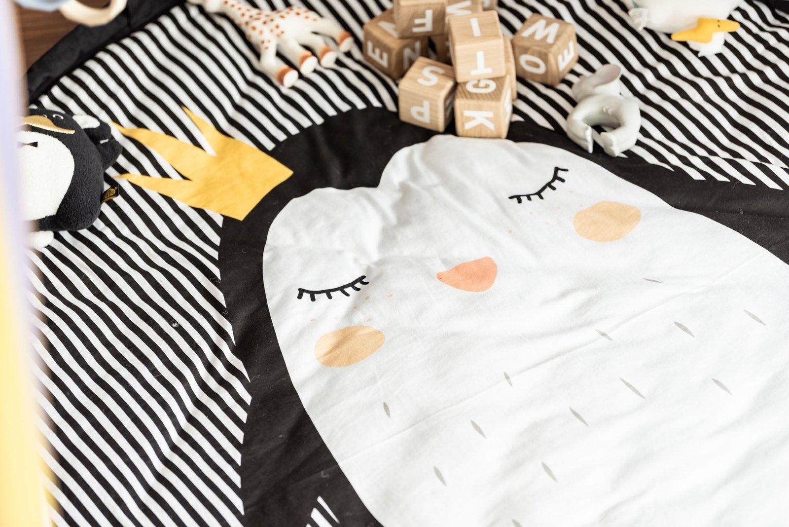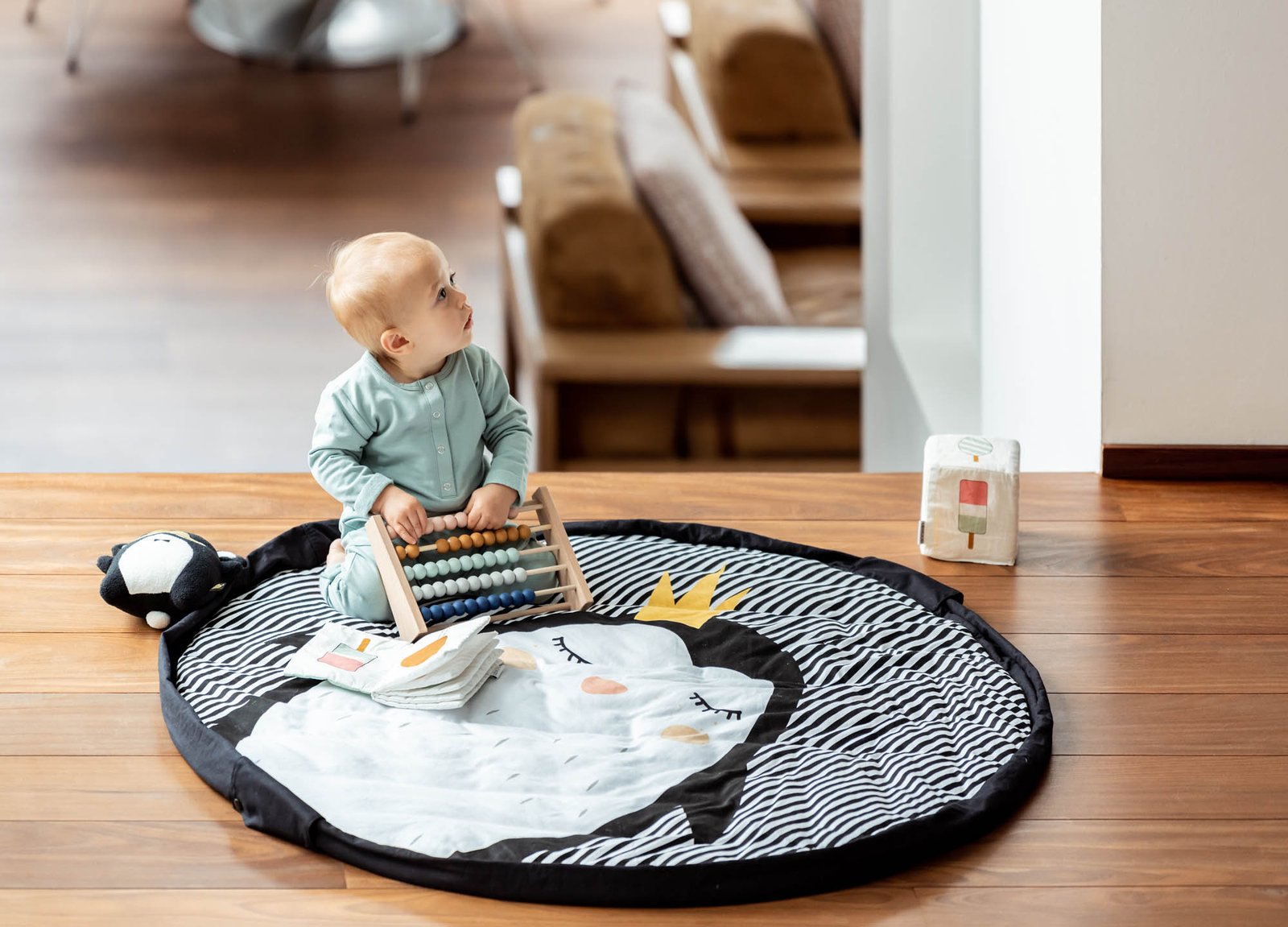 Soft play mat for babies. Inside you’ll find a sweet penguin that all babies will love, while the outside is solid-colored.